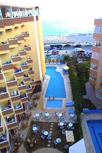 www.galaxybeachhotel.com tel: +(90-242)528-38-38 fax:+(90-242)528-71-17 Расположение: расположен в 135 км от аэропорта г. Анталья, в 14 км от г. Аланья, в районе Махмутлар, через дорогу от собственного пляжа. Отель: в отеле 111 номеров: 106 стандартных номеров, 5 семейных номеров. 75 номеров с видом на море и на бассейн. Пляж: собственный, песок. Зонтики, шезлонги - бесплатно. Матрасы - платно. У бассейна: шезлонги - бесплатно Дополнительная информация: конференц-зал Номер: * индивидуальный кондиционер * телевизор * телефон * фен * сейф (платно) * мини-бар (платно) * балкон * ванна Территория: * ресторан (250 чел.) * 3 бара - бар на террасе - витамин-бар (платно) - бар у бассейна * бассейн * фотограф * магазин * прачечная * кабинет врача * анимация * аэробика Развлечение и спорт: Бесплатно: * волейбол на пляже * Турецкая баня * сауна * настольный теннис * тренажерный зал * дартс Платно: * массаж * бильярд |