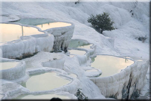 образовали белоснежные известковые террасы, которые издали напоминают
