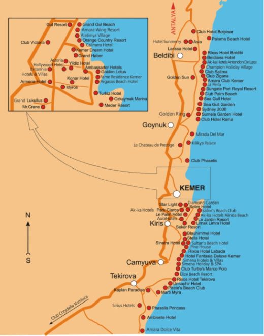Kemeri kuurordid: -Beldibi (25 km Antalyast, 25 km Kemerist)