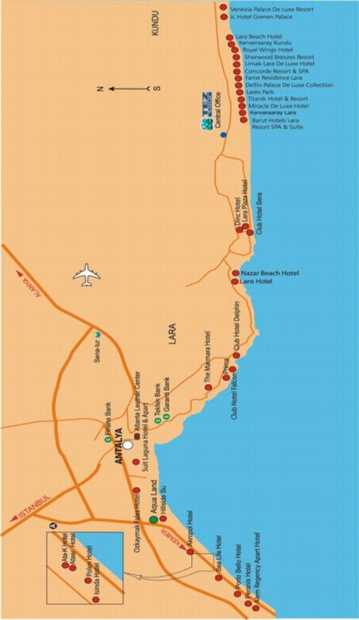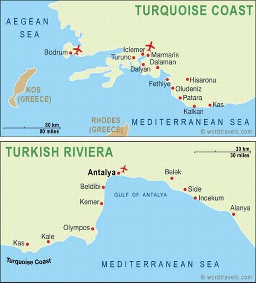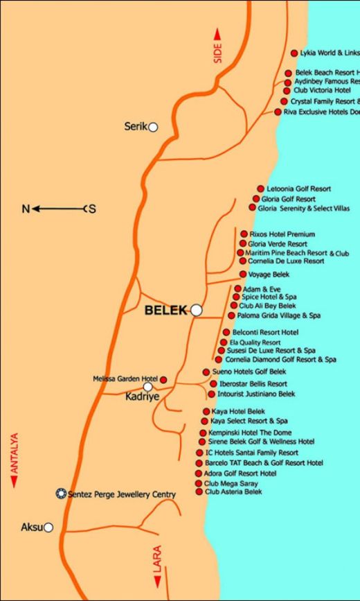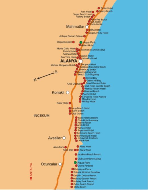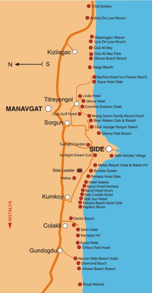 Side 65 km ja Alanya 130 km kaugusel Antalyast. Need regioonid koosnevad