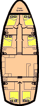 Спальные места для 12 гостей в 6-ти двухместных каютах с душем и туалетом.